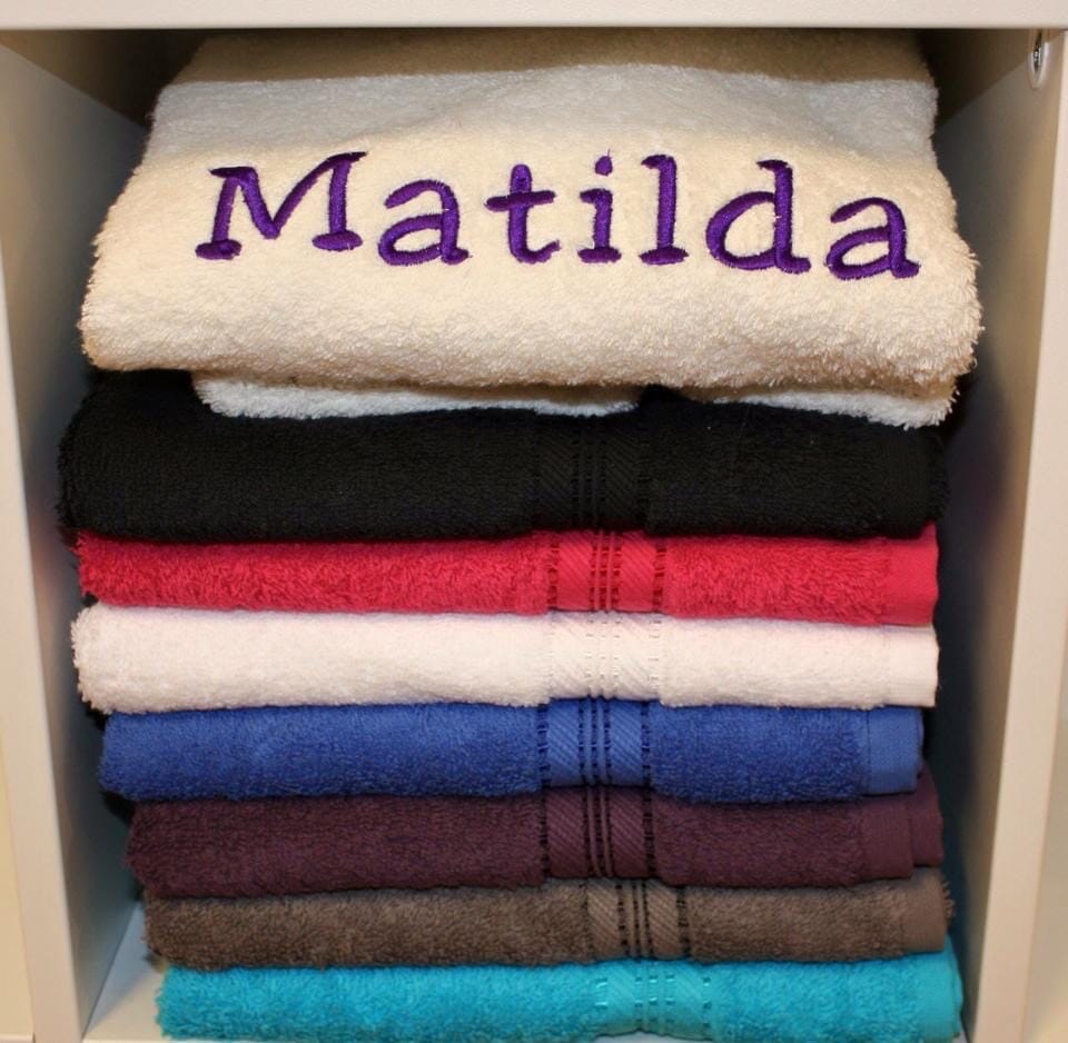 Vi broderer navn på håndklær for å gi dem et mere personlig preg.
